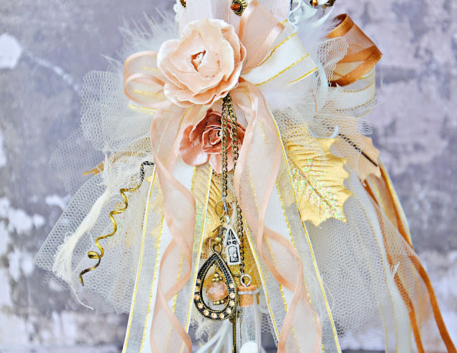 Well its that time of year again and I decided to create something a little special. I like to dress things up and make them pretty, so I decided to create a Christmas Angel to go with our gold Christmas table decor. The Memory Hardware pearls and trims along with the gorgeous metallic leaves and flowers worked beautifully to create her gown.